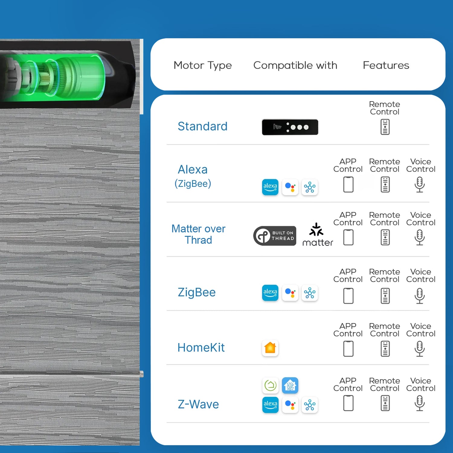 Smooth, cord free operation for modern spaces. Open or close with voice, remote, or app for a clean and effortless look.