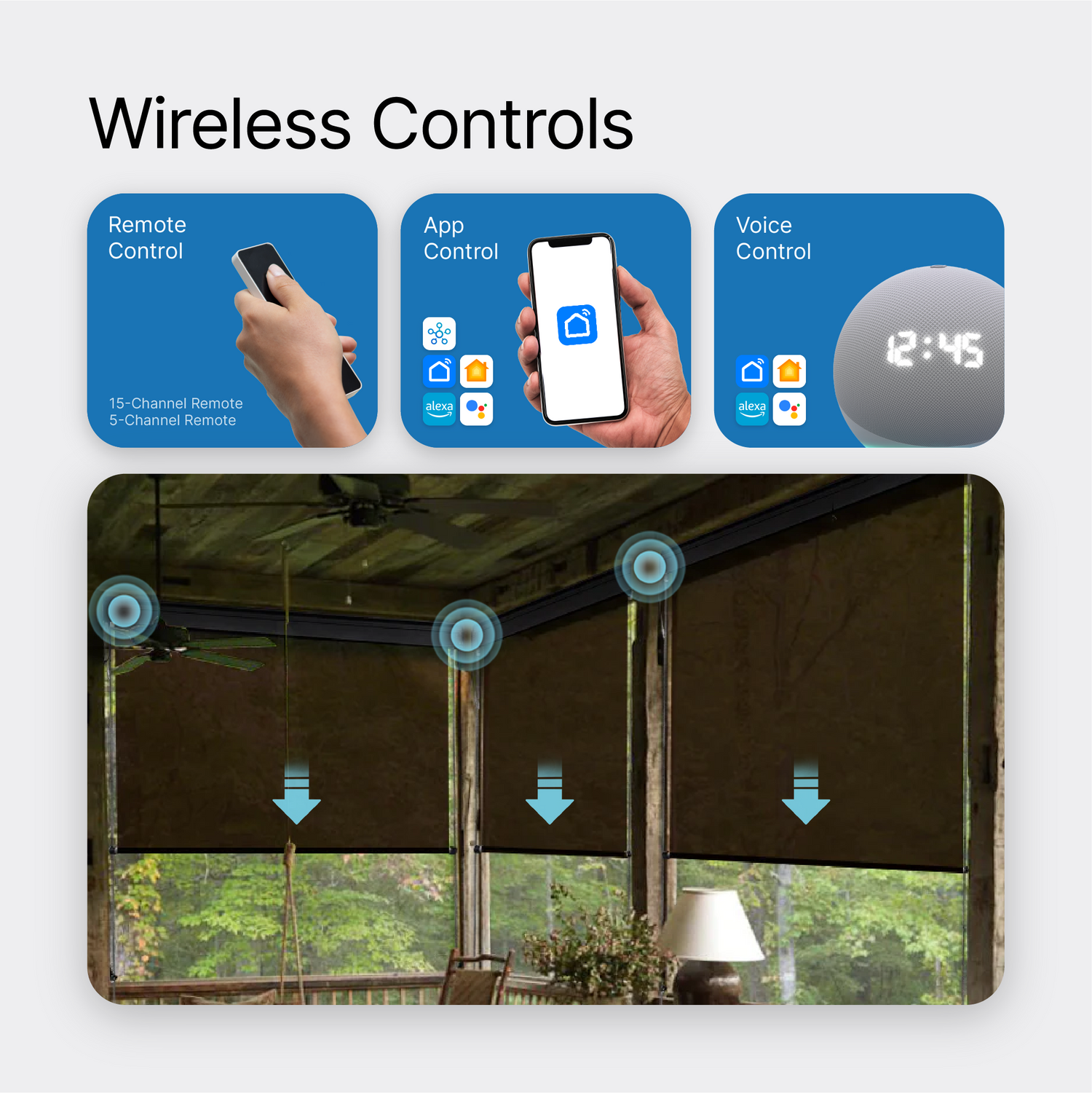 The multi-channel remote control can control up to 15 sets of blinds separately. You can also control all blinds simultaneously by choosing the 0 channel.