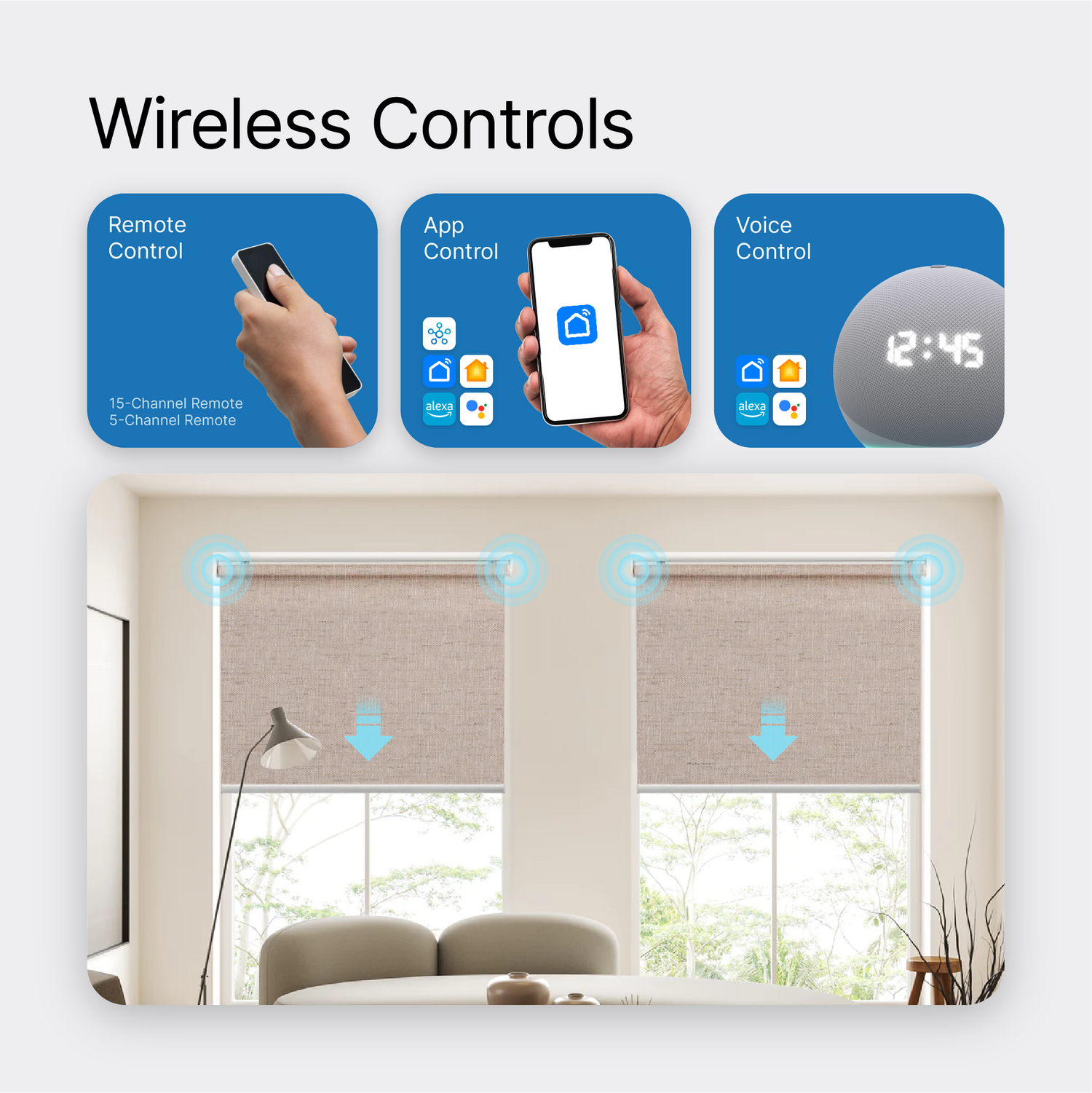 Set blackout scenes for sleep, focus, or movie time. Use the remote, app, or voice assistant to drop your shades in an instant — no cords, no effort.